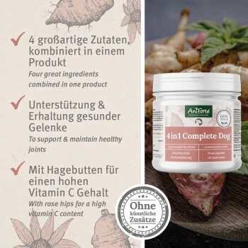 AniForte 4in1 Complete Dog ist mit wertvollen Naturstoffen, wie Bierhefe, Hagebuttenschalen und Grünlippmuschelpulver eine rein natürliche Rundumversorgung für Deinen Hund. Das hochwertige Naturprodukt liefert einen wertvollen Beitrag, um das Hunde Immunsystem zu stärken, den Bewegungsapparat zu unterstützen und die Darmtätigkeit zu erhalten.