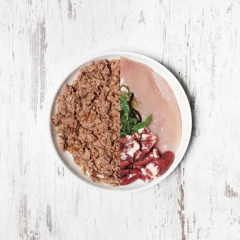 Für eine vollständige Hundemahlzeit müssen die Fleischdosen mit pflanzlichen Komponenten ergänzt werden. Neben über 90 % Frischfleisch und Innereien ergänzen hochwertige Zutaten wie Distel- oder Leinöl, Seealgen, Mineralerde und Eierschalpulver als wichtige Nährstofflieferanten jede „Fleisch pur“ Dose.