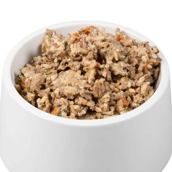 Muskelfleisch von der Ziege mit Bio-Reis und Bio-Karotte. Ergänzungsfuttermittel für Hunde – glutenfrei, purinreduziert, proteinreduziert, fettreduziert. Spezialfutter für Hunde mit Leishmaniose.